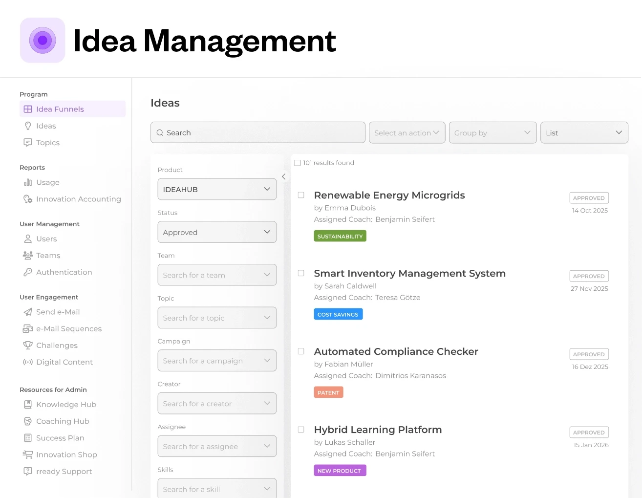 IDEAHUB - rready's established idea management tool - serves as the backbone of Swisscom's idea management process across B2B and B2C. The platform enables structured submission, evaluation, and prioritization of ideas while ensuring full transparency across the idea lifecycle. Through close collaboration, the idea management platform has been aligned with Swisscom's Lean philosophy and integrated seamlessly into existing systems via an API-first architecture. A modern, user-friendly interface lowers entry barriers and enables intuitive adoption among employees.