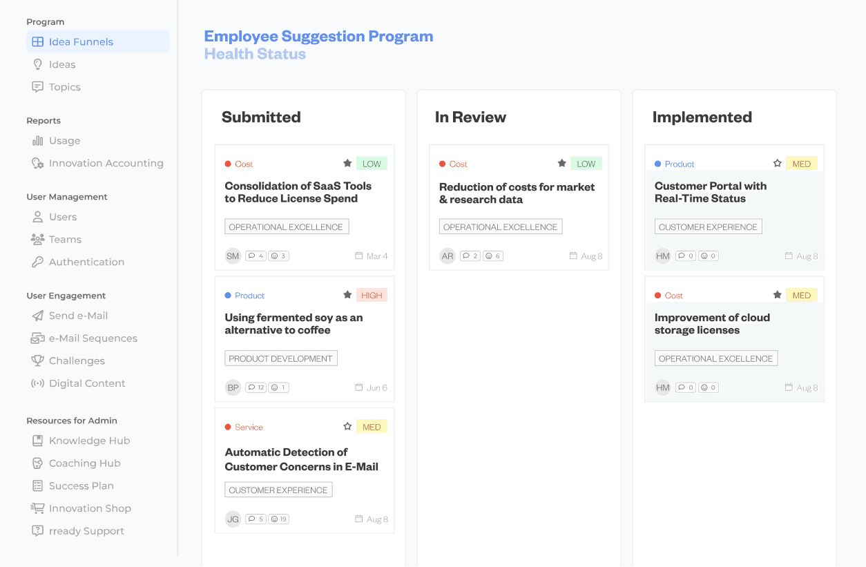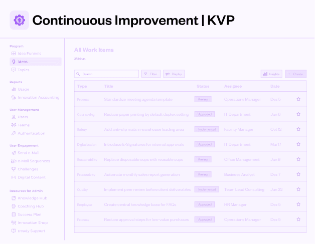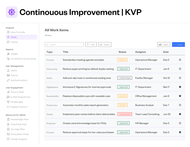 rready enables organizations to systematically capture ideas, prioritize actions, and track impact — making continuous improvement scalable and measurable.