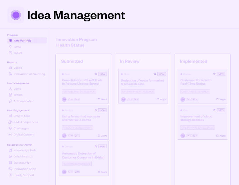 Um diese Reibungsverluste zu minimieren, ist der Einsatz professioneller Infrastruktur unerlässlich. Plattormen wie die von rready ermöglichen es, dezentrale Ideenflüsse zentral zu bündeln, transparent zu bewerten und methodisch (z. B. nach dem Lean-Startup-Prinzip) zu begleiten. Dies scha die notwendige Transparenz, um Synergien zwischen verschiedenen Abteilungen zu nutzen und den „Return on Idea“ messbar zu machen